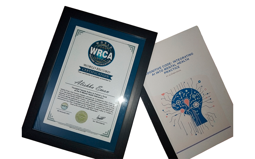 Alishba Eman, from Karachi, Pakistan, was born on 14 September 2003. At the age of 21, she authored and published the internationally noted book Cognitive Code: Integrating AI into Mental Health Practice. The work was completed around 15 June 2025 and officially published on 20 June 2025, marking a pioneering contribution at the intersection of artificial intelligence and mental health. Her achievement has garnered attention and recognition from multiple governmental bodies and professional platforms, including the UN Sindh Human Rights Department, the Government of Sindh, the UK Global Youth Awards, and the US Neoteric Summit. Verified by the WRCA, this accomplishment has been recognized as the “Youngest Female Author to Publish a Book at the AI-Mental Health Intersection.”