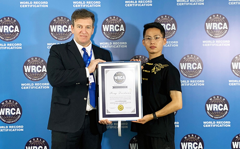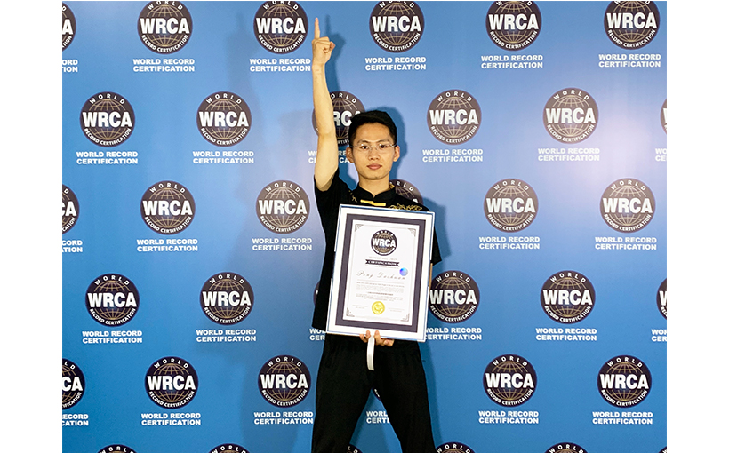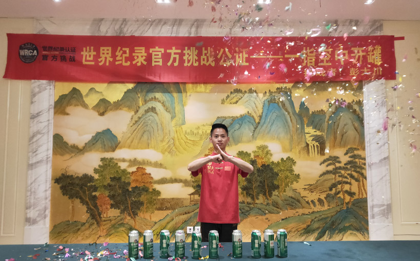 Peng Dachuan (China) successfully pierced 7 drink cans which were thrown in the air using the index finger in one minute in Zhenjiang City, Jiangsu, China, on 25 April 2021. Verified by the WRCA, Peng Dachuan set the world record for the “most drink cans pierced by index finger in the air in one minute”.